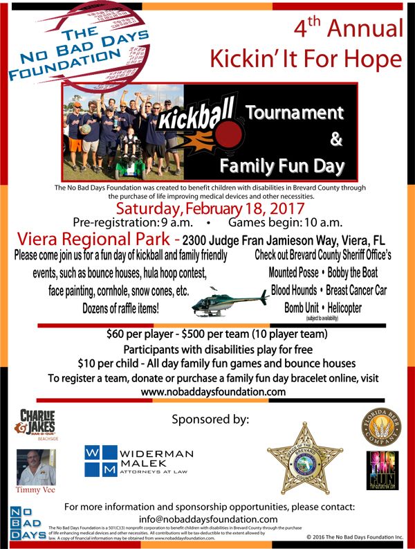 The No Bad Days Foundation supports children in Brevard County who have medical disabilities, but are unable to acquire life enhancing medical devices and other necessities. The No Bad Days Foundation is holding its 4th annual Kickin’ It For Hope kickball tournament on February 18th in order to raise money to purchase these medical devices. Kickin’ It For Hope has always been fun for the whole family. There will be bounce houses, a hula hoop contest, face painting, cornhole, snow cones, and more. As always, 100% of all donations will go toward helping these disabled children. Please consider registering to attend today!